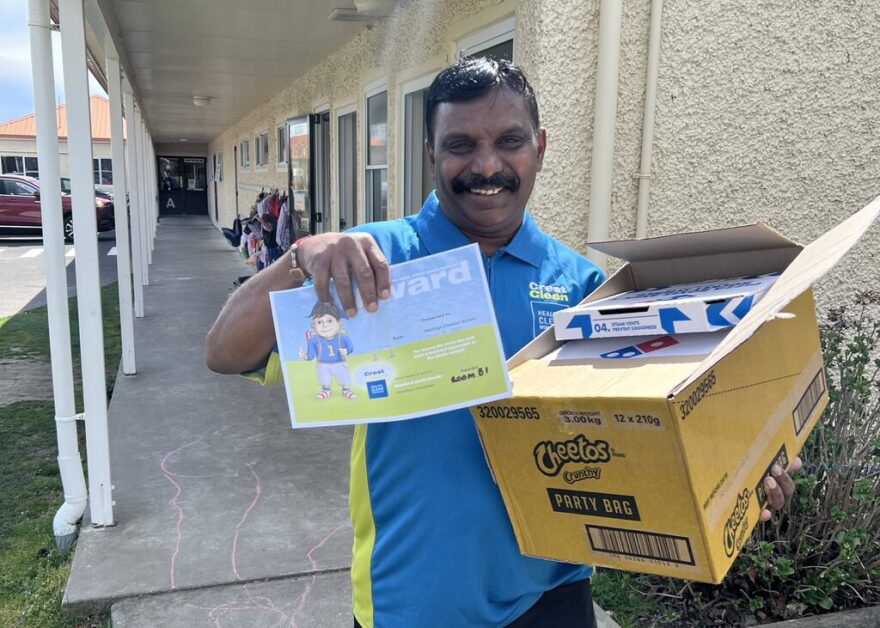 Hawke’s Bay franchise owner Jay Gounder has been part of the school since 2015, and every term he brings a bit of fun to the classrooms with the Cleanest Classroom Awards. It’s a friendly competition among the 10 primary classes, where the tidiest room wins a pizza lunch and a certificate. At the end of each school year, Jay takes it a step further by treating every student to an ice block – a tradition the kids absolutely love and look forward to.