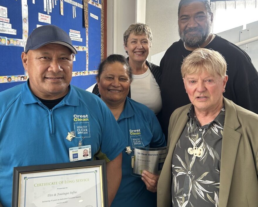 For the past 10 years, Sunita and Praveen Dutt have proudly run their CrestClean franchise — and one of their very first customers, Waimauku Primary School, remains one of their most valued. Since day one, Deputy Principal Anita Newland has been their main point of contact, growing a lasting relationship